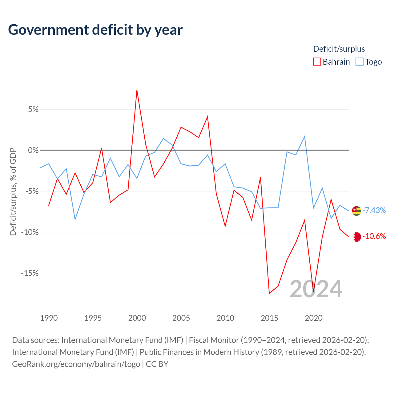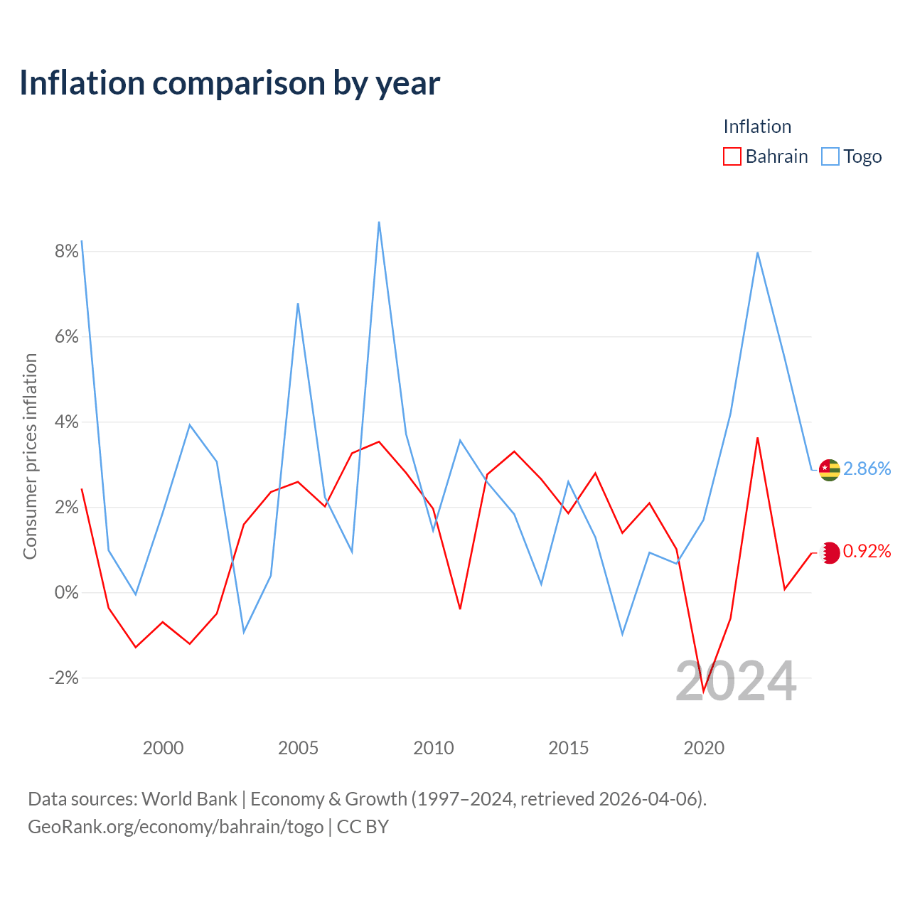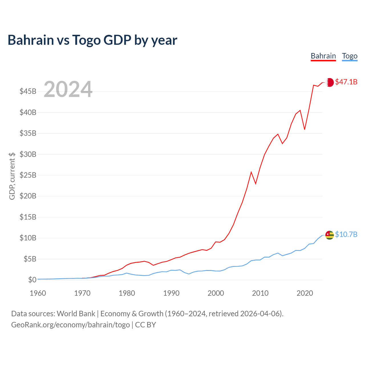 Bahrain has a GDP of $47.1B compared to $10.7B for Togo, ranking 96/197 and 154/197 by economy size, respectively.