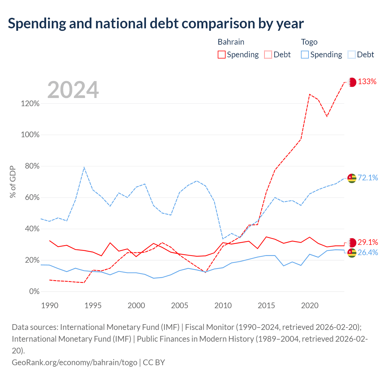 Bahrain has $62.8B in government debt (133.4% of GDP), compared to $7.68B (72.1% of GDP) in Togo.
