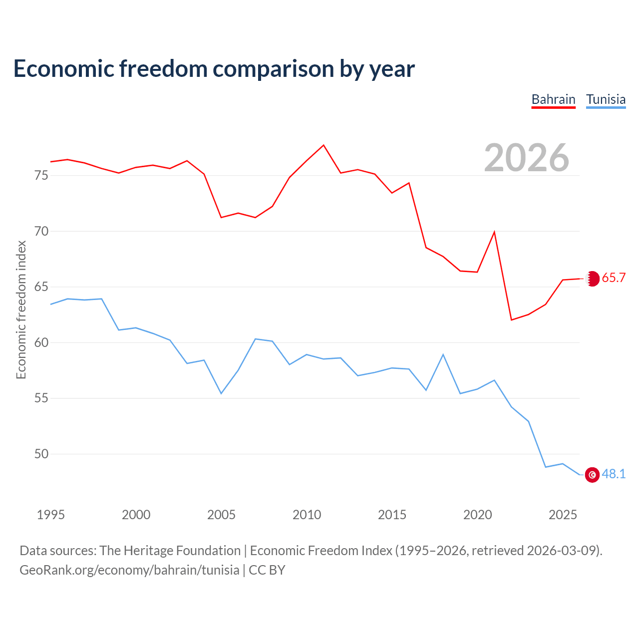 Data sources: The Heritage Foundation | Economic Freedom Index (1995–2026, retrieved 2026-03-09).