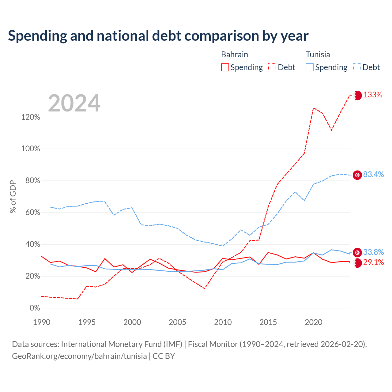 Bahrain has $62.8B in government debt (133.4% of GDP), compared to $42.8B (83.4% of GDP) in Tunisia.
