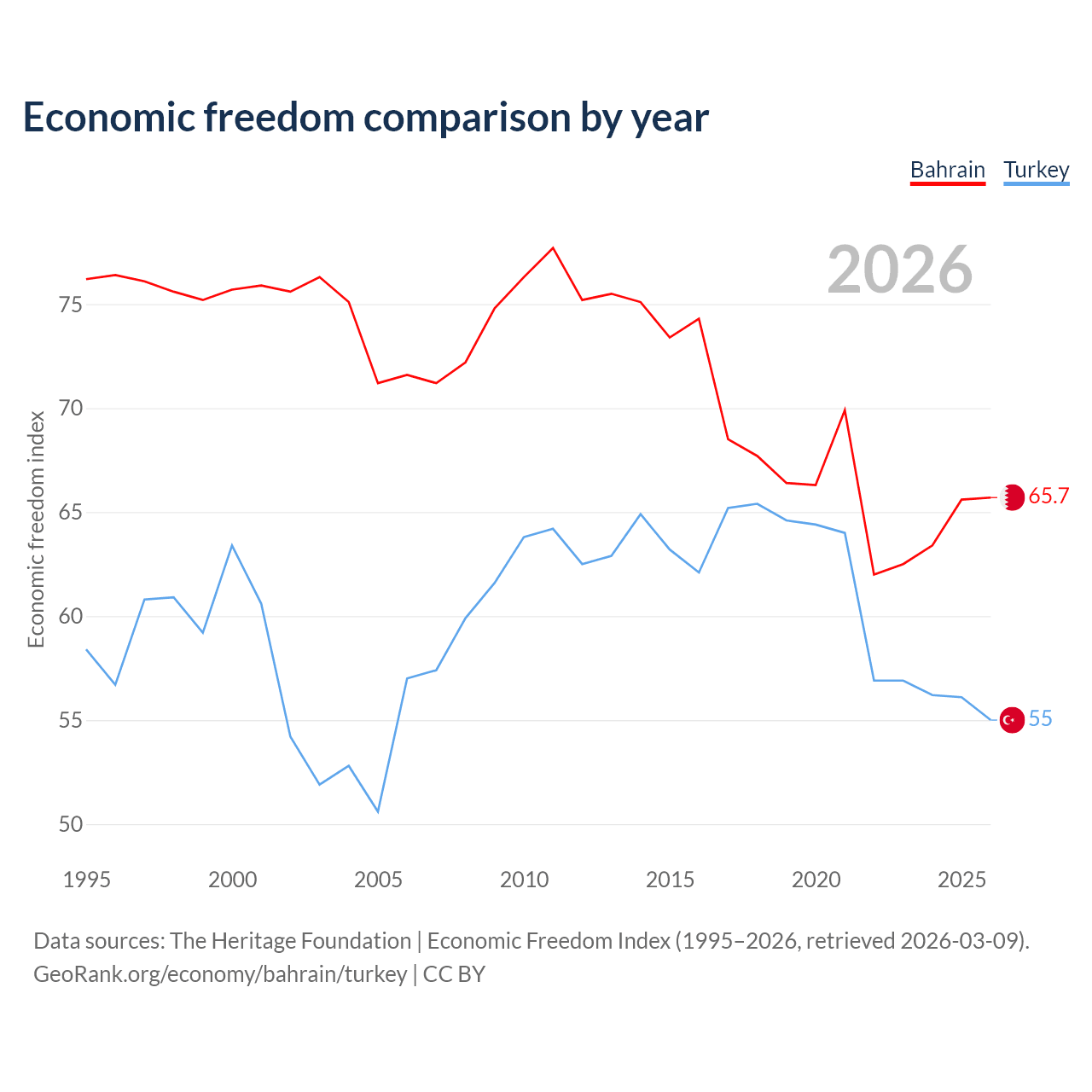 The Economic Freedom Index for Bahrain is 65.7, ranking 63/197, compared to 55 for Turkey, ranking 129/197. The chart above displays a comparison of annual changes in economic freedom indexes.