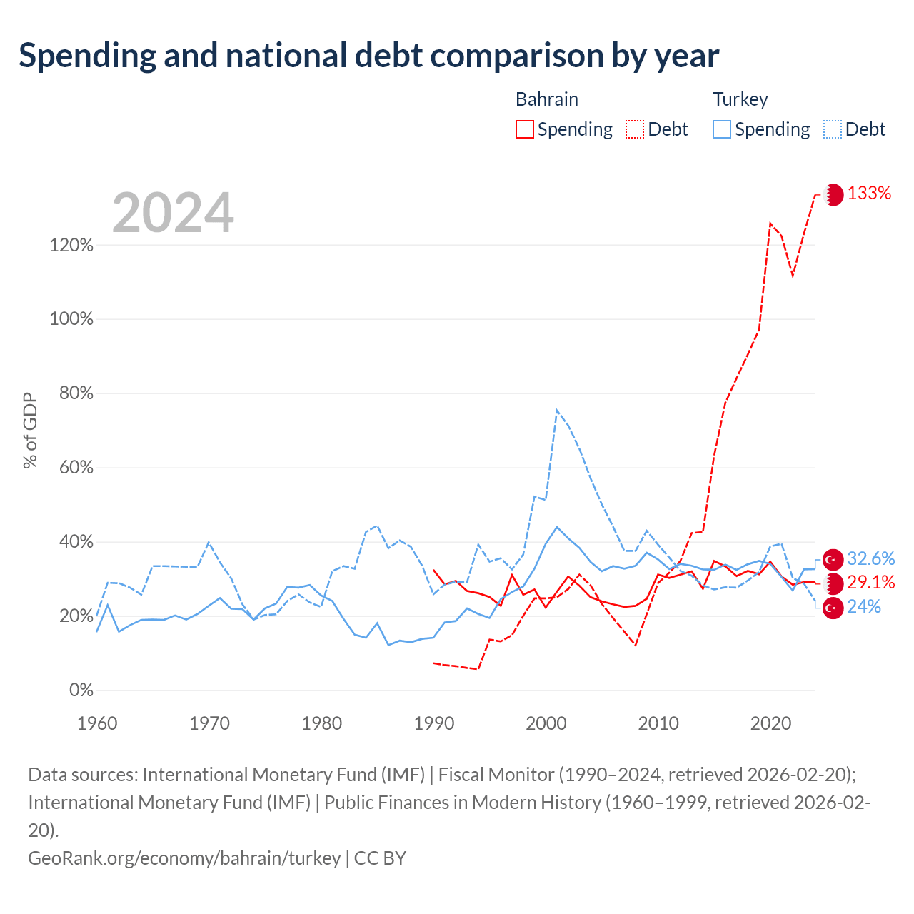 Bahrain has $62.8B in government debt (133.4% of GDP), compared to $327B (24% of GDP) in Turkey.