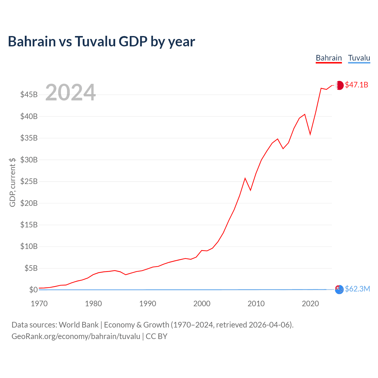 Bahrain has a GDP of $47.1B compared to $62.3M for Tuvalu, ranking 96/197 and 196/197 by economy size, respectively.