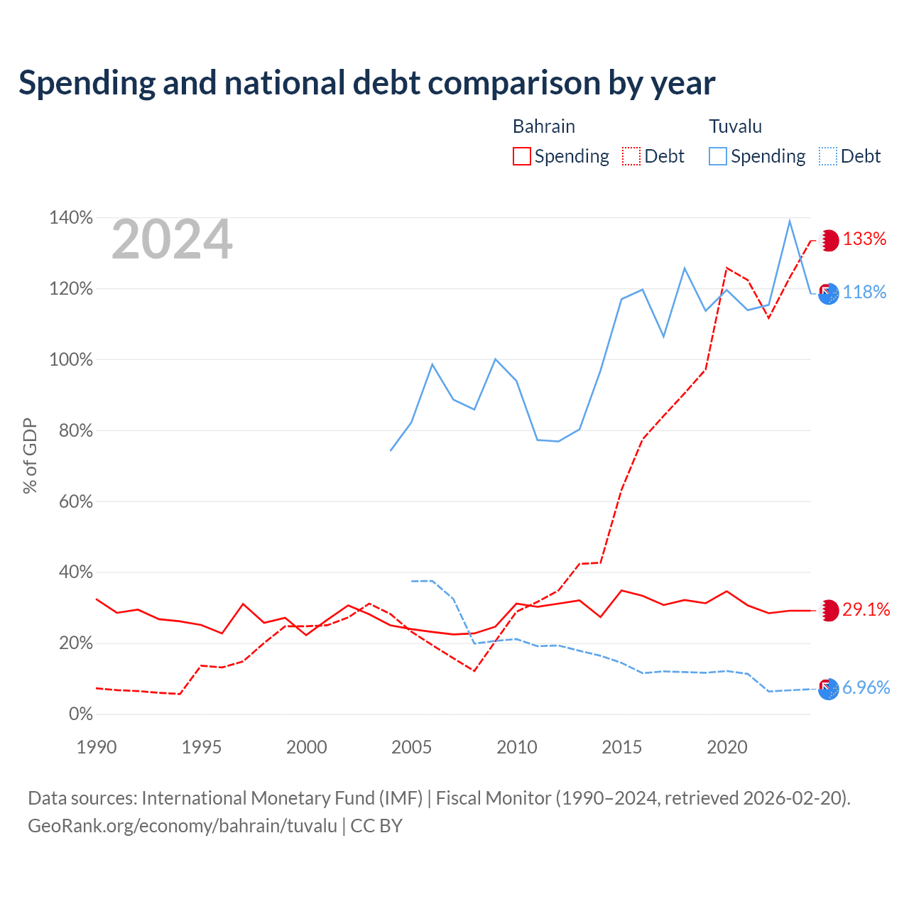 Bahrain has $62.8B in government debt (133.4% of GDP), compared to $4.15M (6.96% of GDP) in Tuvalu.