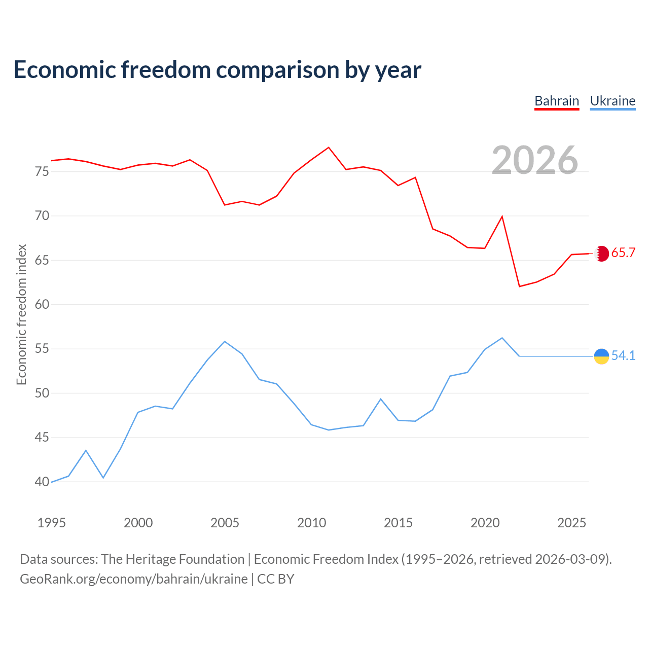 The Economic Freedom Index for Bahrain is 65.7, ranking 63/197, compared to 54.1 for Ukraine, ranking 135/197. The chart above displays a comparison of annual changes in economic freedom indexes.