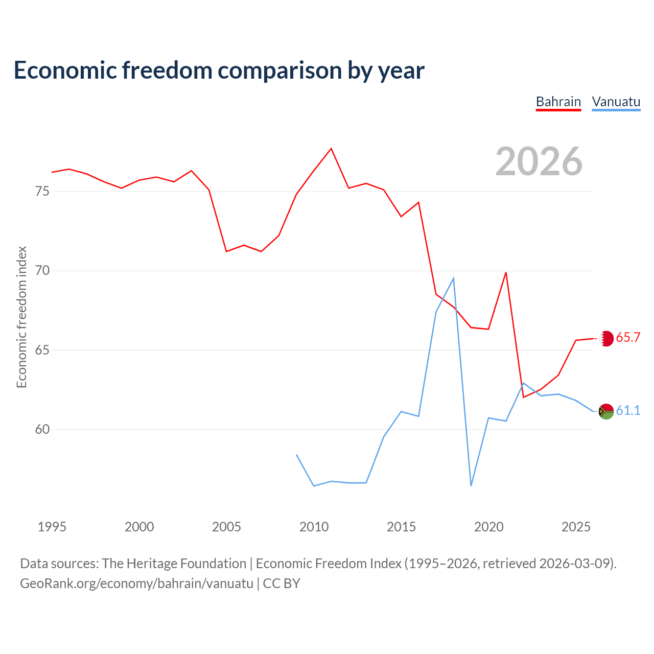 The Economic Freedom Index for Bahrain is 65.7, ranking 63/197, compared to 61.1 for Vanuatu, ranking 92/197. The chart above displays a comparison of annual changes in economic freedom indexes.