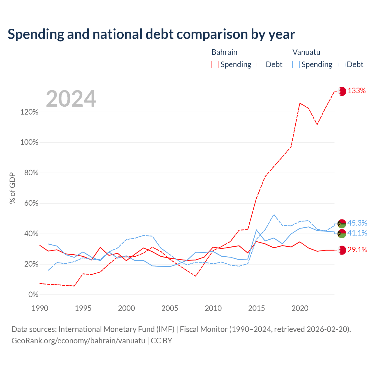 Bahrain has $62.8B in government debt (133.4% of GDP), compared to $507M (45.3% of GDP) in Vanuatu.
