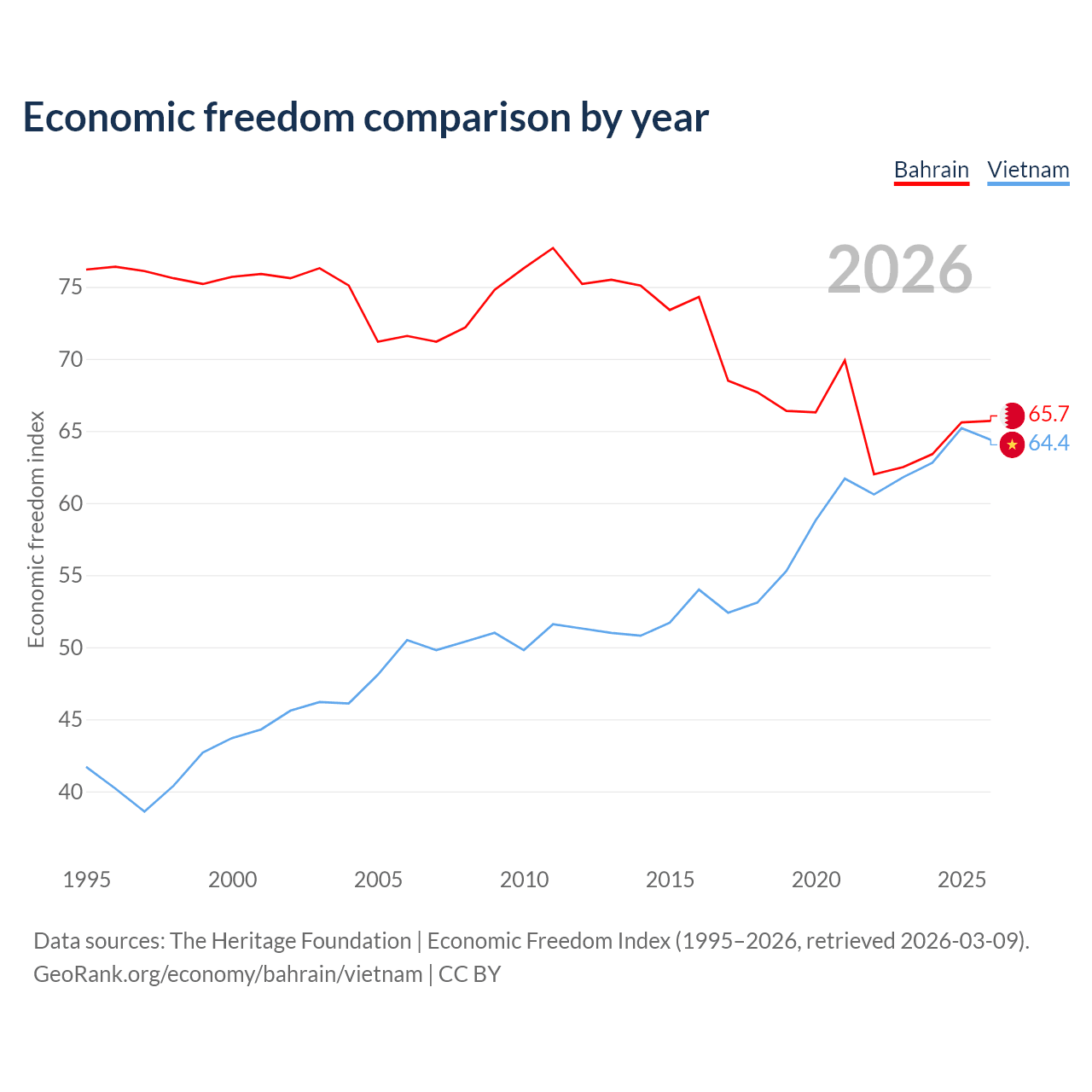 The Economic Freedom Index for Bahrain is 65.7, ranking 63/197, compared to 64.4 for Vietnam, ranking 73/197. The chart above displays a comparison of annual changes in economic freedom indexes.