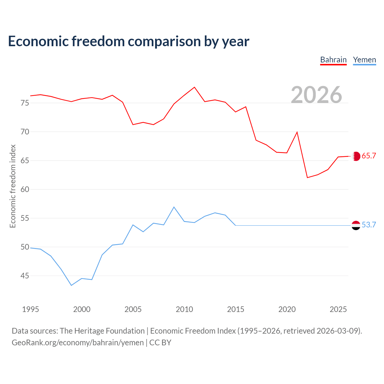 The Economic Freedom Index for Bahrain is 65.7, ranking 63/197, compared to 53.7 for Yemen, ranking 138/197. The chart above displays a comparison of annual changes in economic freedom indexes.