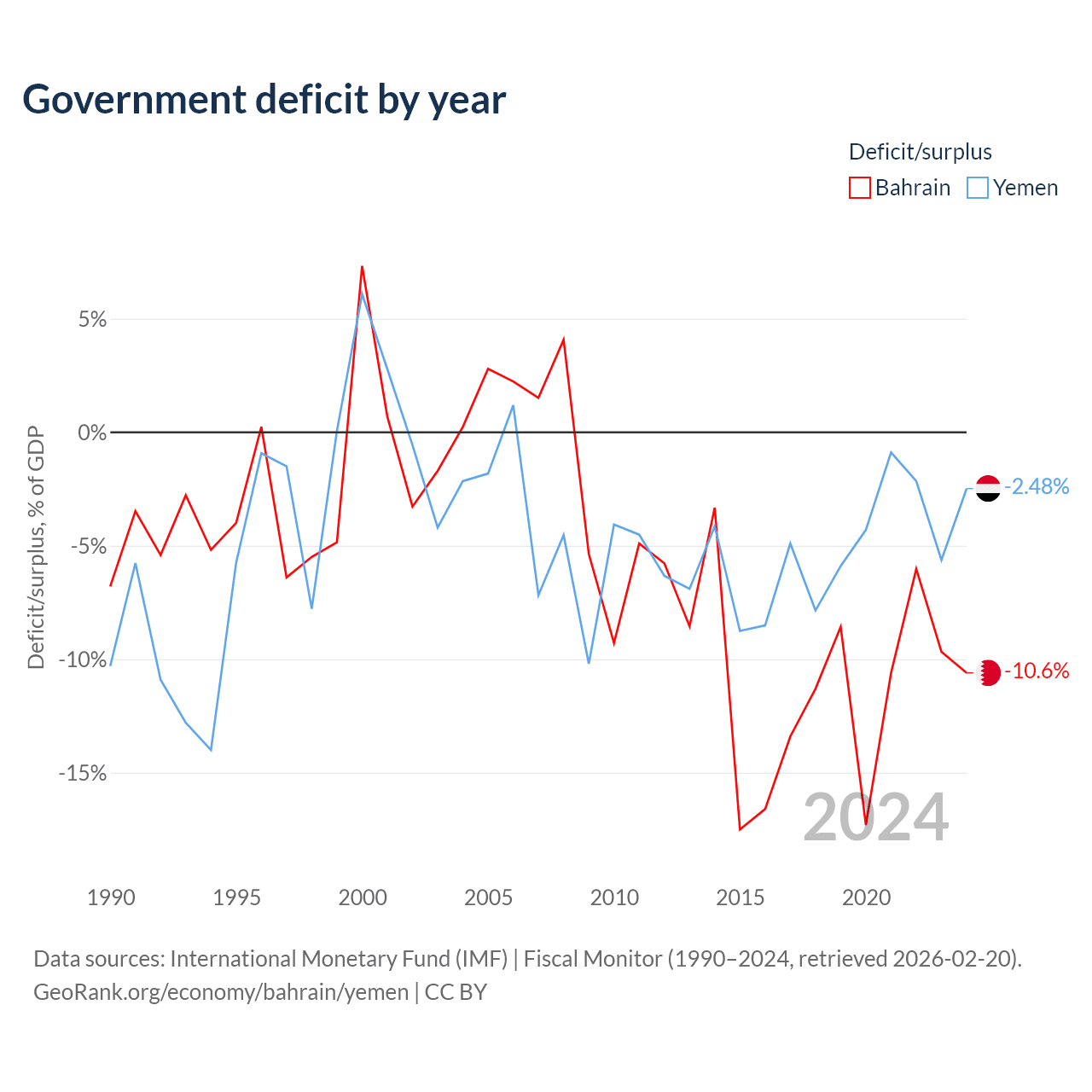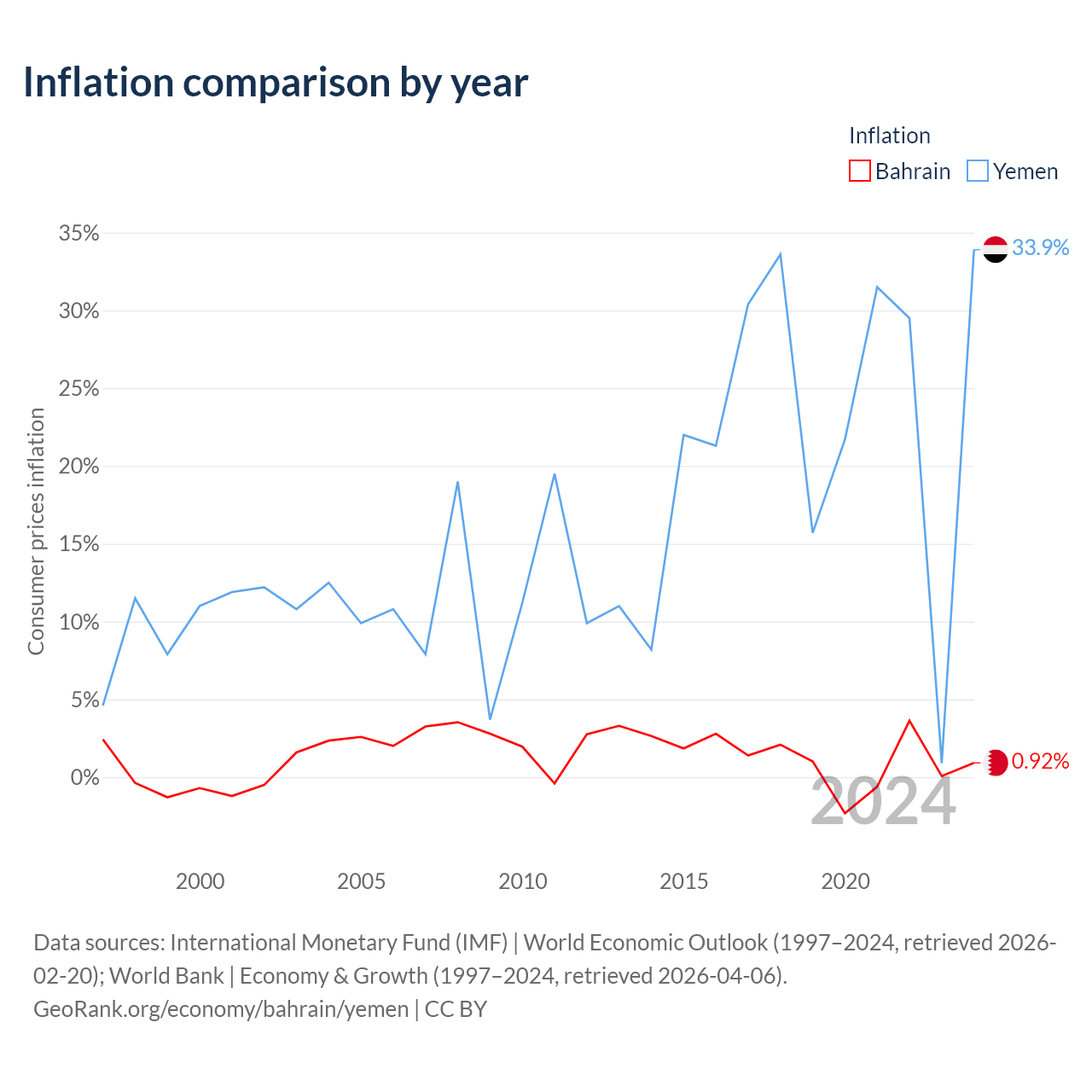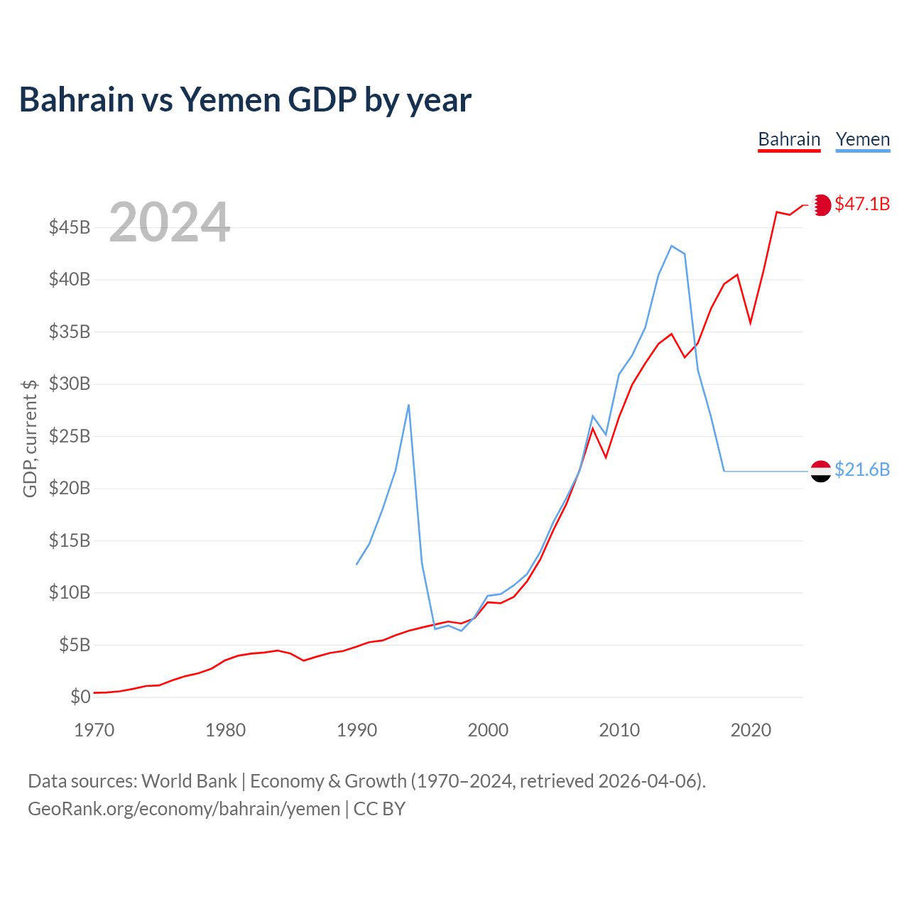 Bahrain has a GDP of $47.1B compared to $21.6B for Yemen, ranking 96/197 and 125/197 by economy size, respectively.