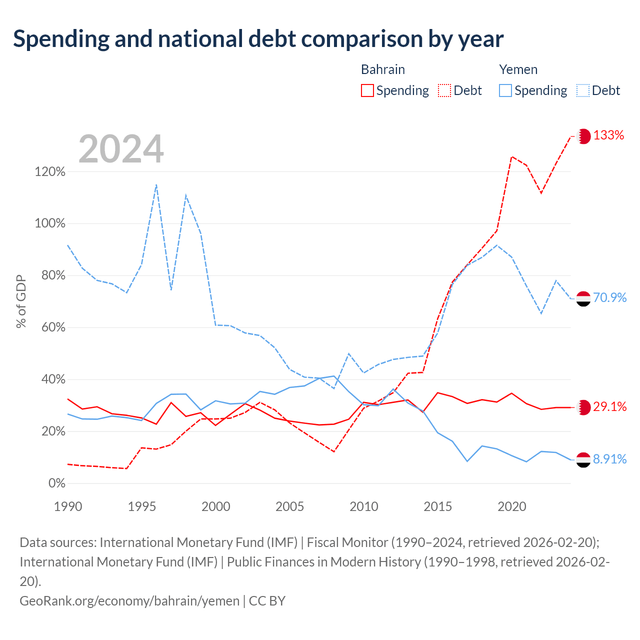 Bahrain has $62.8B in government debt (133.4% of GDP), compared to $18.8B (70.9% of GDP) in Yemen.