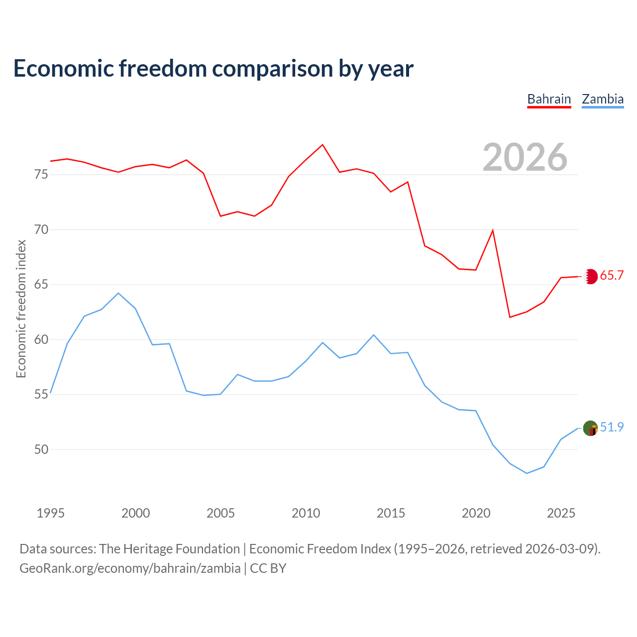 The Economic Freedom Index for Bahrain is 65.7, ranking 63/197, compared to 51.9 for Zambia, ranking 152/197. The chart above displays a comparison of annual changes in economic freedom indexes.