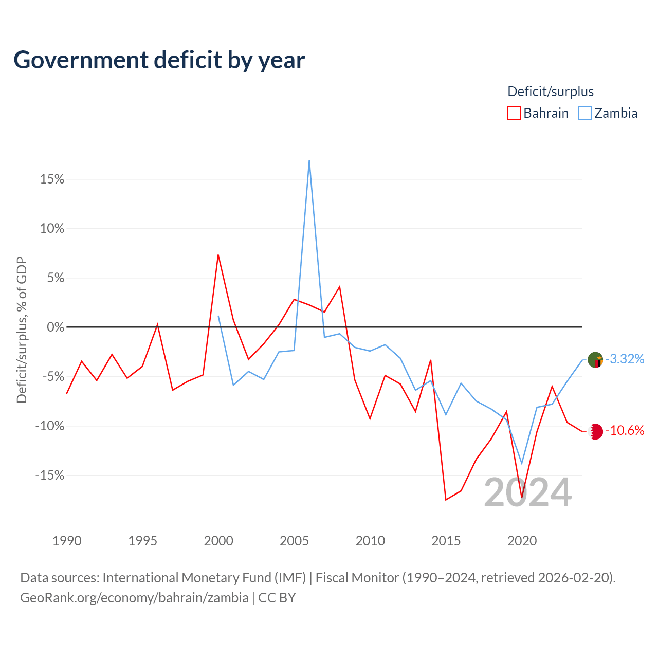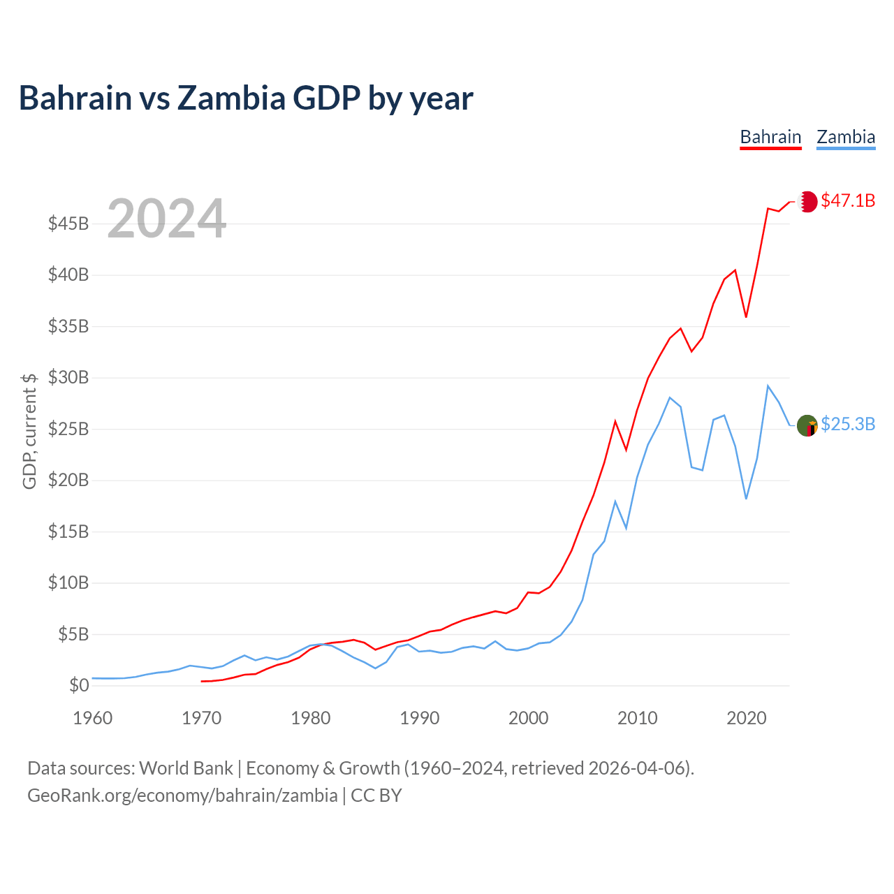 Bahrain has a GDP of $47.1B compared to $25.3B for Zambia, ranking 96/197 and 116/197 by economy size, respectively.