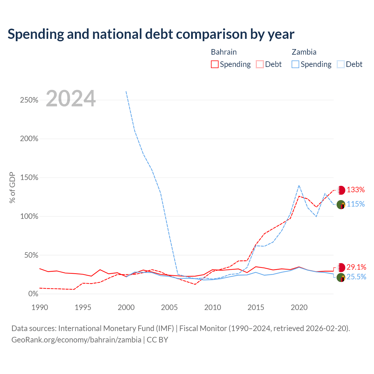 Bahrain has $62.8B in government debt (133.4% of GDP), compared to $29.1B (114.9% of GDP) in Zambia.
