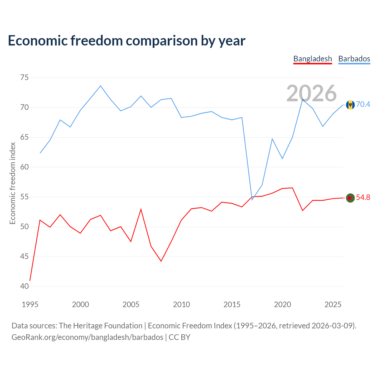 The Economic Freedom Index for Bangladesh is 54.8, ranking 131/197, compared to 70.4 for Barbados, ranking 34/197. The chart above displays a comparison of annual changes in economic freedom indexes.