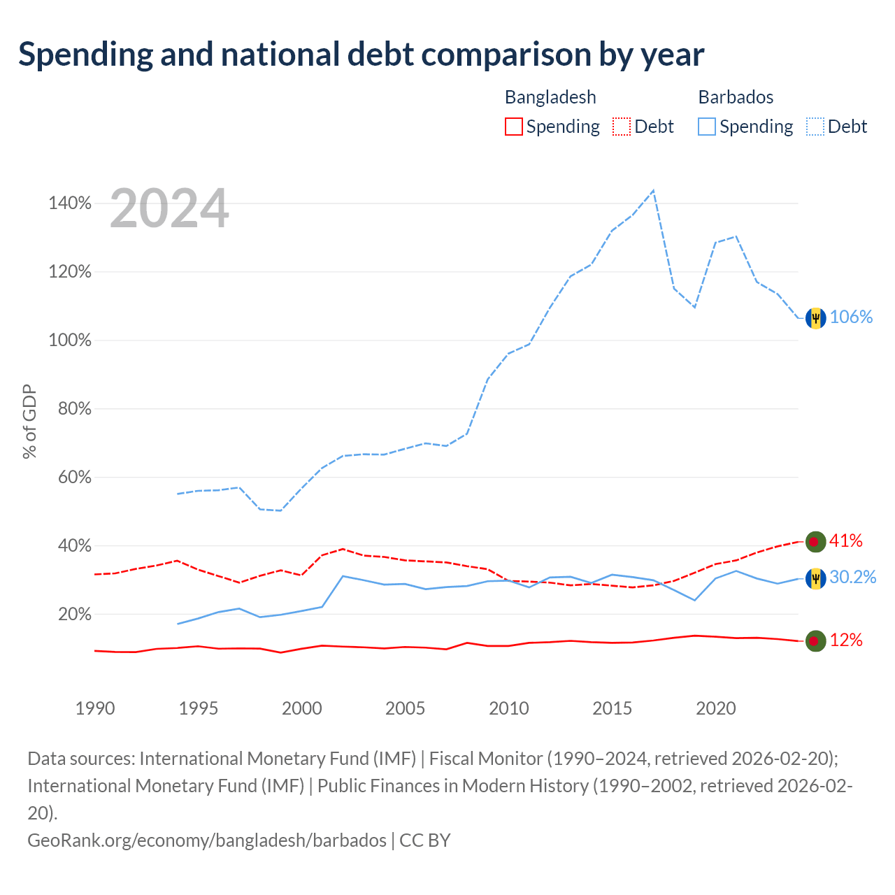 Bangladesh has $184B in government debt (41% of GDP), compared to $7.97B (106.3% of GDP) in Barbados.