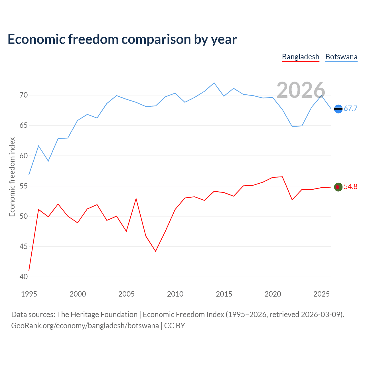 The Economic Freedom Index for Bangladesh is 54.8, ranking 131/197, compared to 67.7 for Botswana, ranking 53/197. The chart above displays a comparison of annual changes in economic freedom indexes.