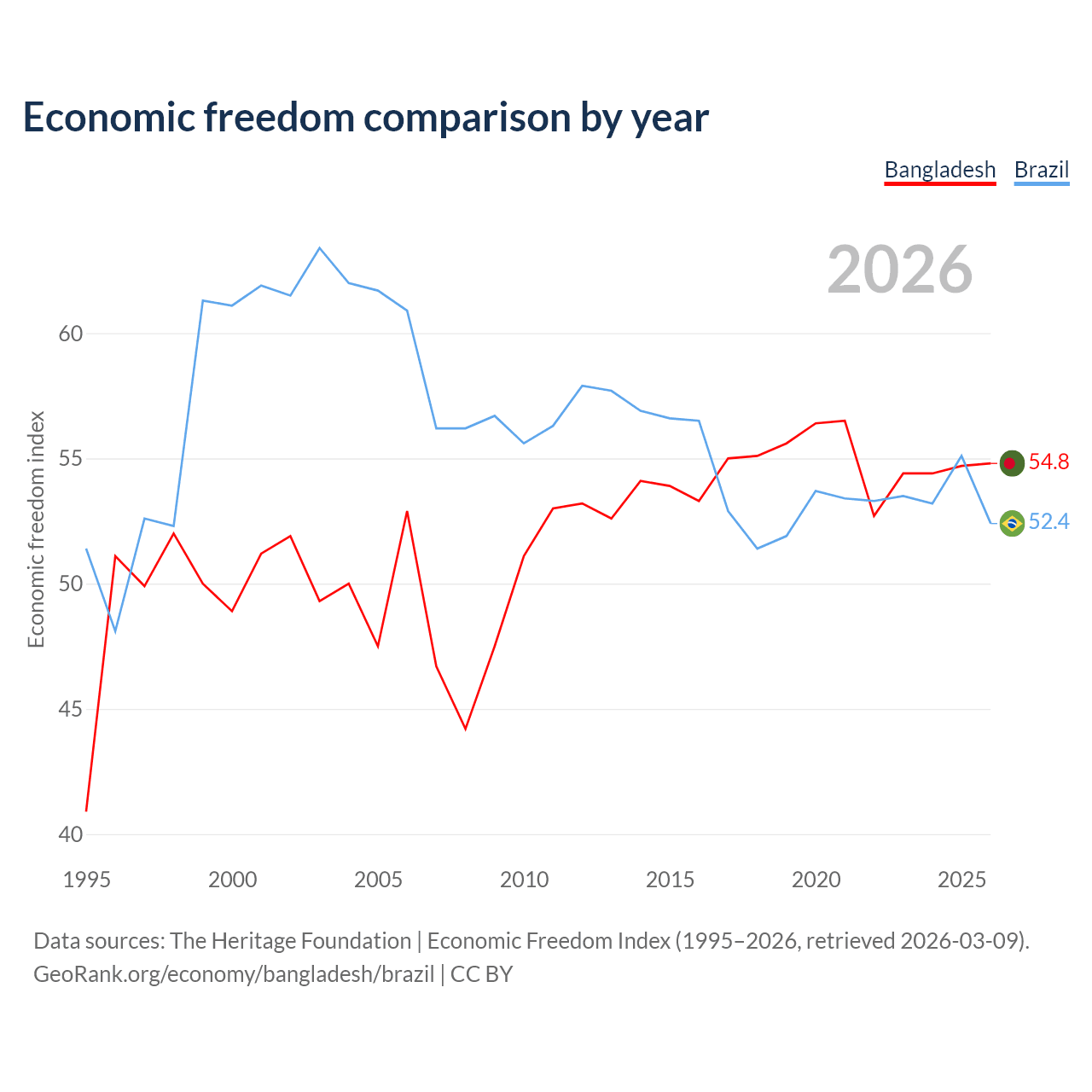 Data sources: The Heritage Foundation | Economic Freedom Index (1995–2026, retrieved 2026-03-09).