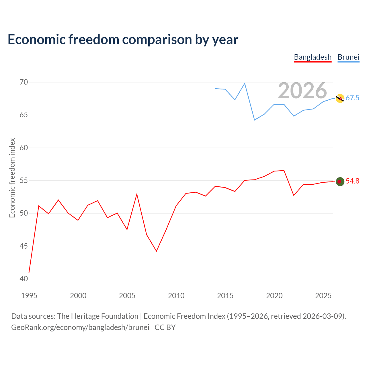 The Economic Freedom Index for Bangladesh is 54.8, ranking 131/197, compared to 67.5 for Brunei, ranking 55/197. The chart above displays a comparison of annual changes in economic freedom indexes.