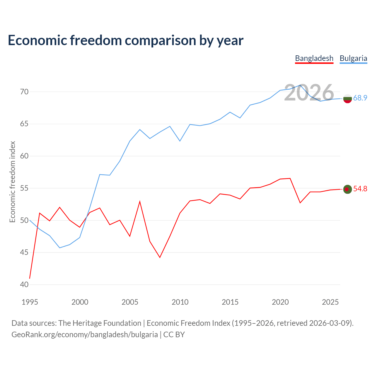 The Economic Freedom Index for Bangladesh is 54.8, ranking 131/197, compared to 68.9 for Bulgaria, ranking 44/197. The chart above displays a comparison of annual changes in economic freedom indexes.
