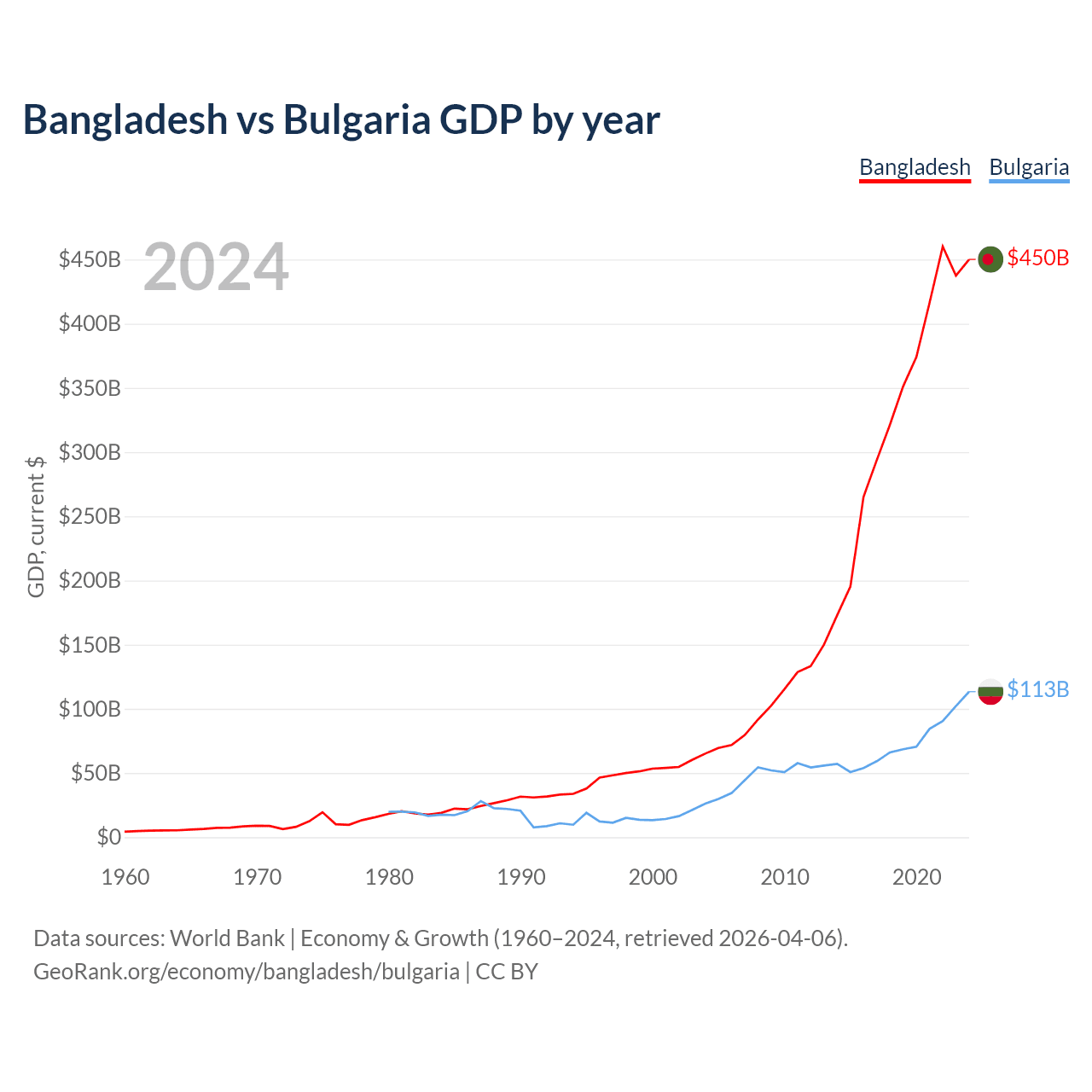 Bangladesh has a GDP of $450B compared to $113B for Bulgaria, ranking 36/197 and 67/197 by economy size, respectively.