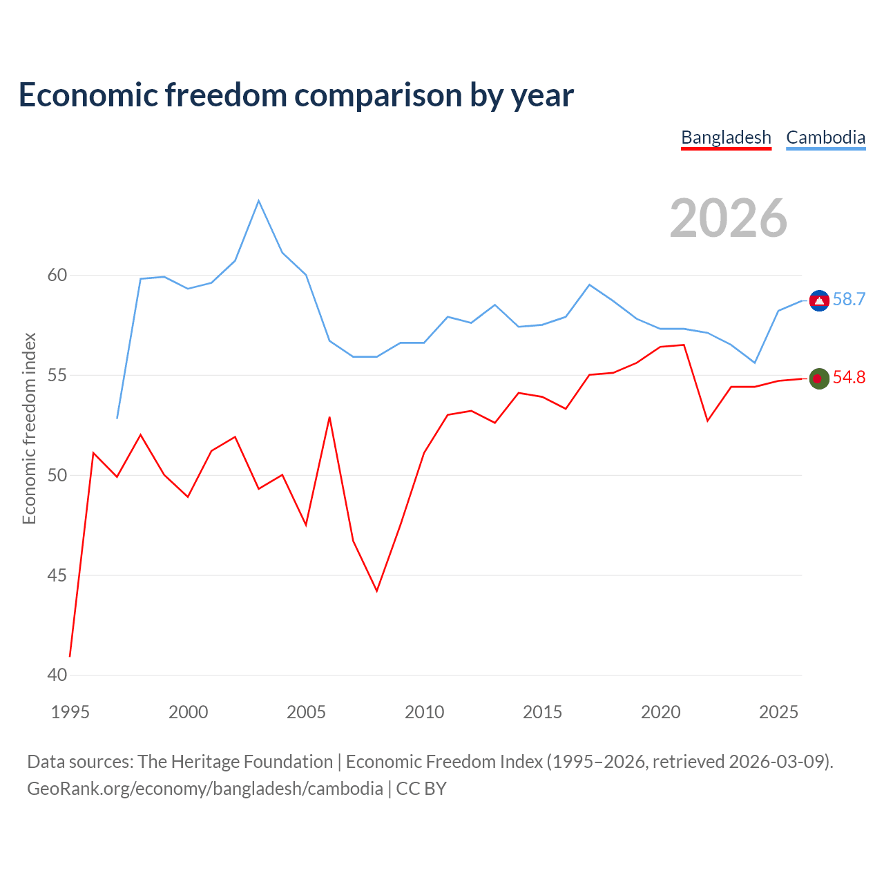 The Economic Freedom Index for Bangladesh is 54.8, ranking 131/197, compared to 58.7 for Cambodia, ranking 108/197. The chart above displays a comparison of annual changes in economic freedom indexes.