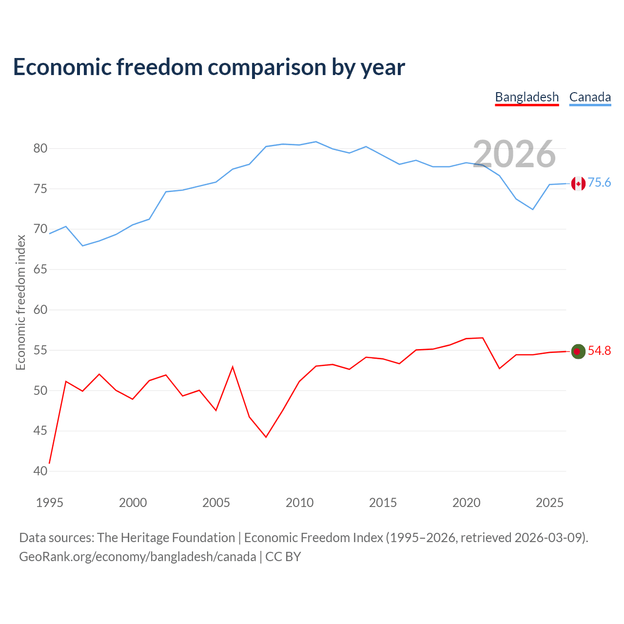 The Economic Freedom Index for Bangladesh is 54.8, ranking 131/197, compared to 75.6 for Canada, ranking 17/197. The chart above displays a comparison of annual changes in economic freedom indexes.