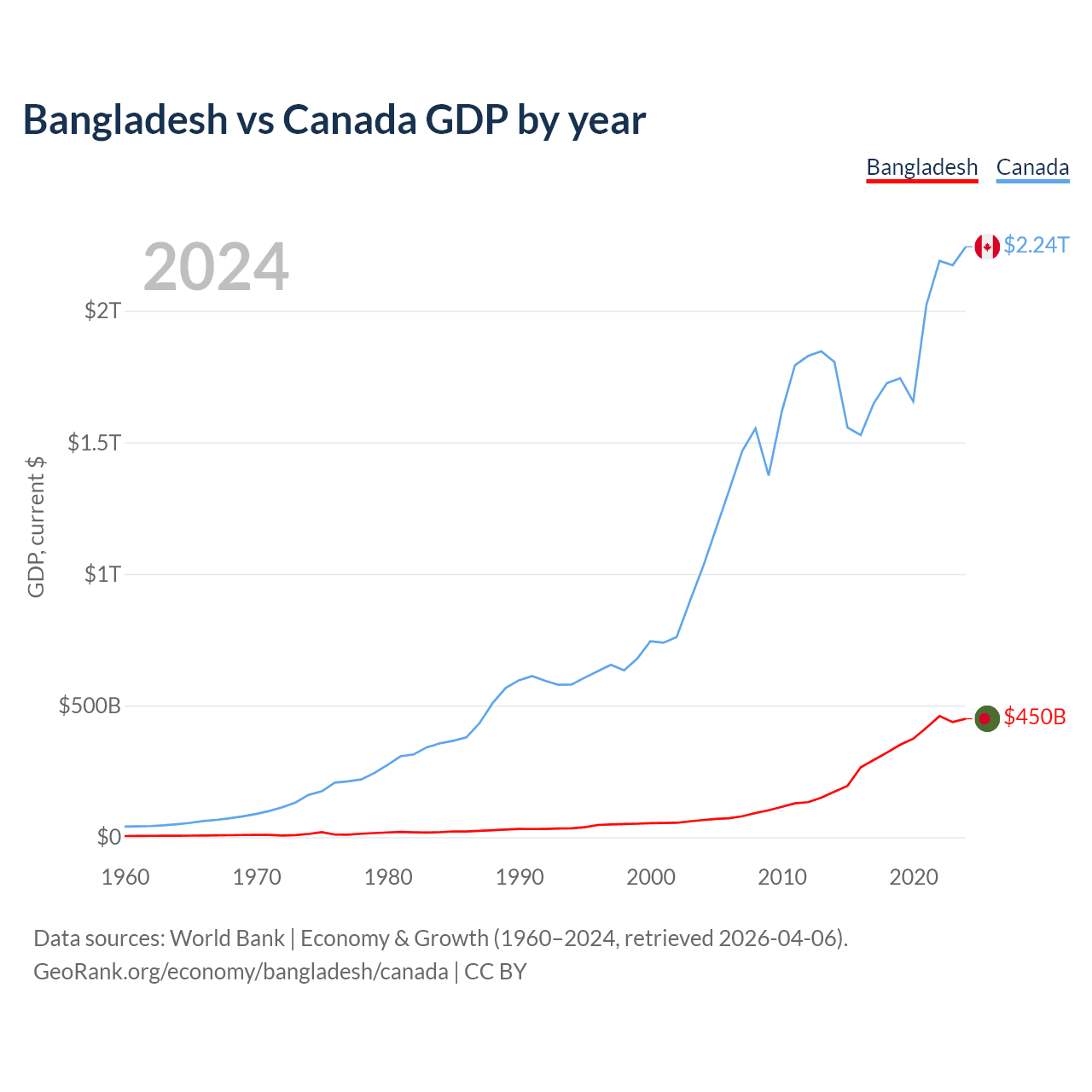 Bangladesh has a GDP of $450B compared to $2.24T for Canada, ranking 36/197 and 9/197 by economy size, respectively.