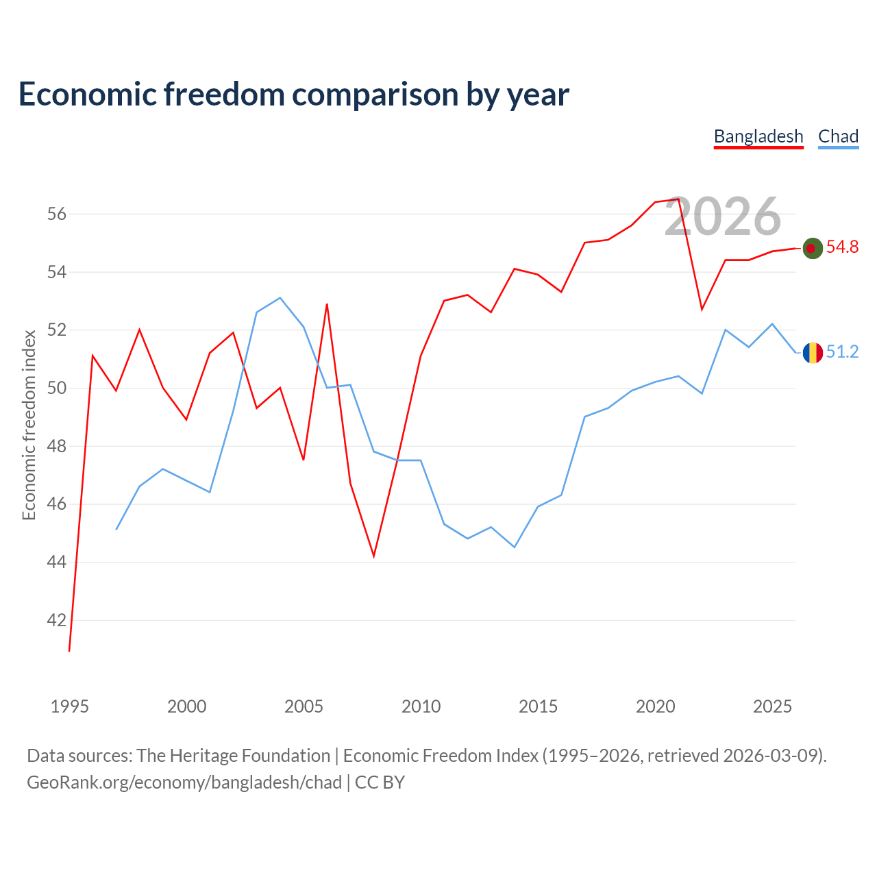 The Economic Freedom Index for Bangladesh is 54.8, ranking 131/197, compared to 51.2 for Chad, ranking 154/197. The chart above displays a comparison of annual changes in economic freedom indexes.