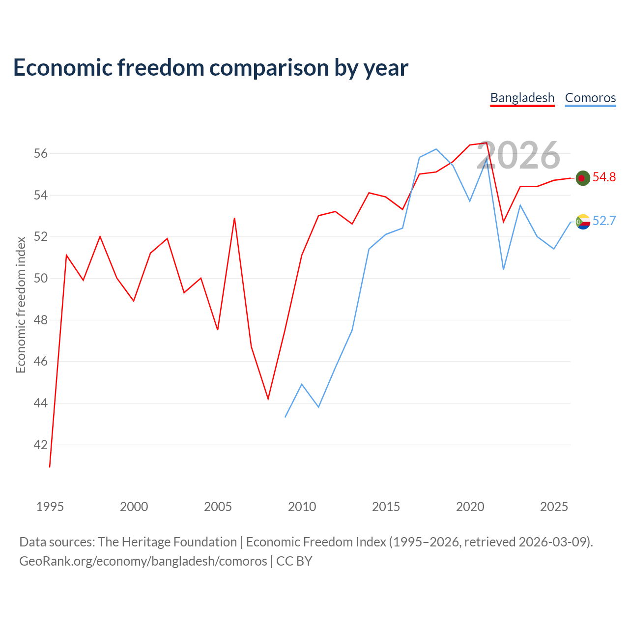 The Economic Freedom Index for Bangladesh is 54.8, ranking 131/197, compared to 52.7 for Comoros, ranking 145/197. The chart above displays a comparison of annual changes in economic freedom indexes.