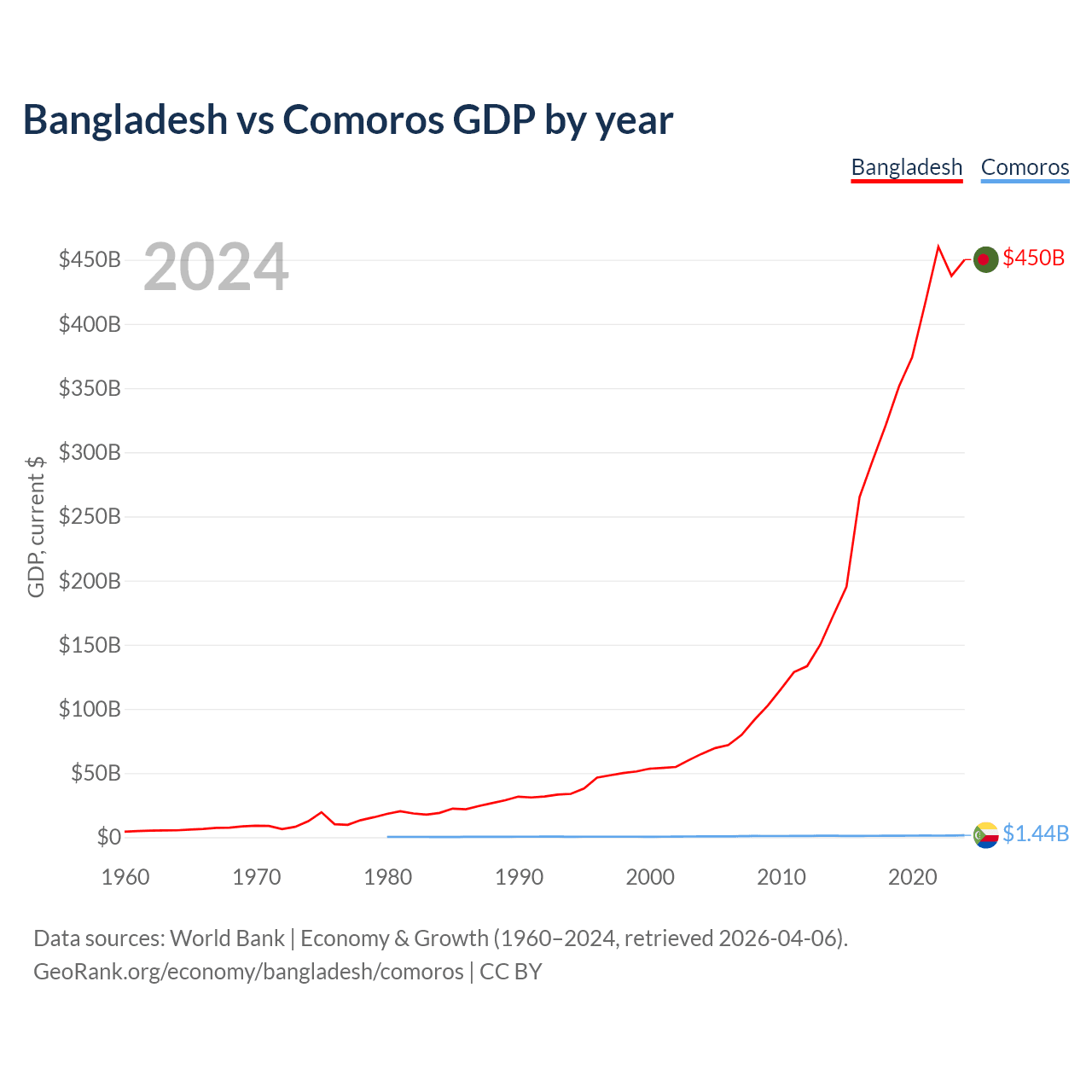 Bangladesh has a GDP of $450B compared to $1.44B for Comoros, ranking 36/197 and 183/197 by economy size, respectively.