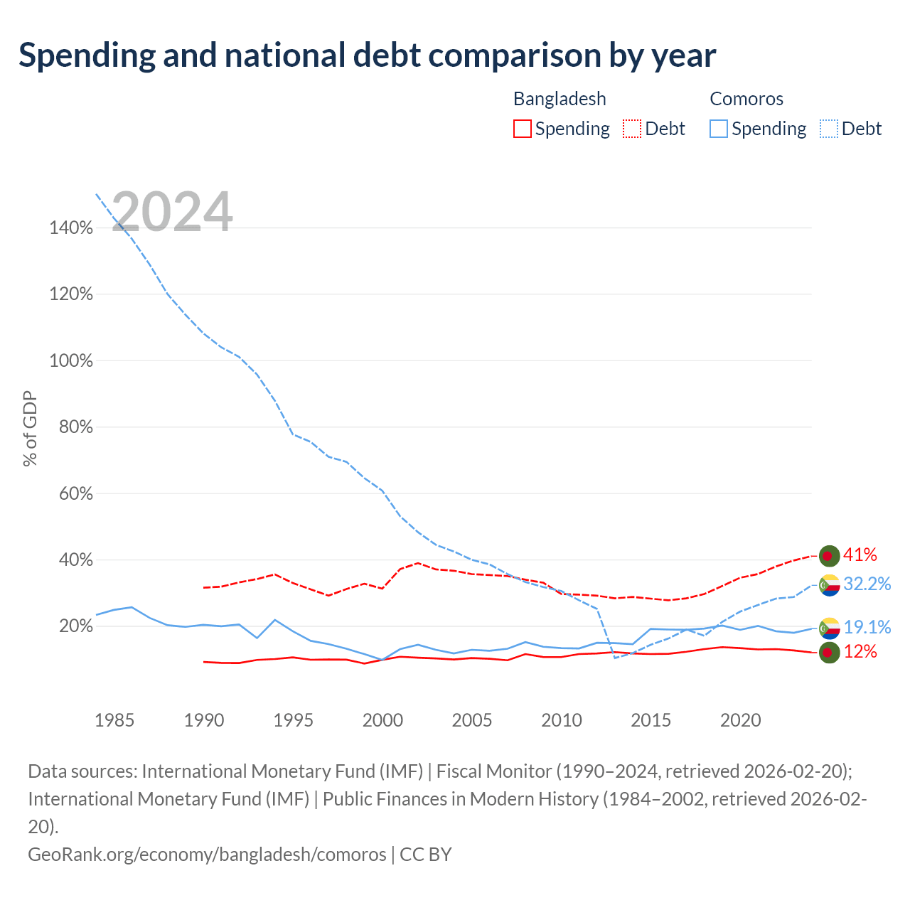Bangladesh has $184B in government debt (41% of GDP), compared to $463M (32.2% of GDP) in Comoros.