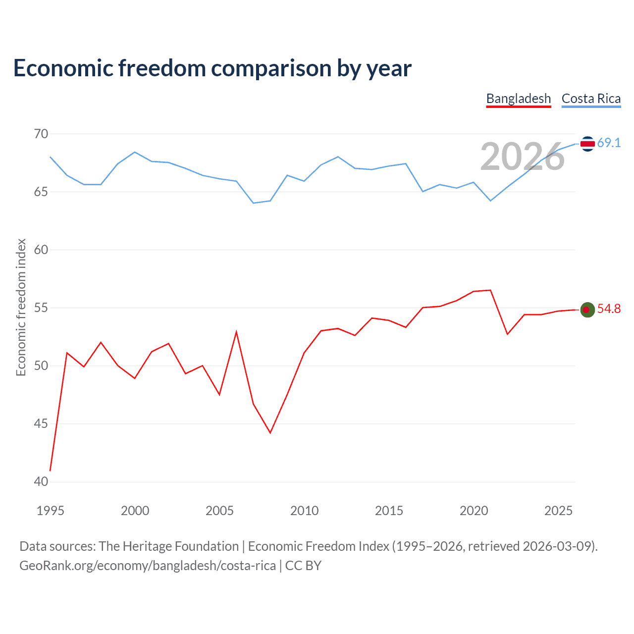The Economic Freedom Index for Bangladesh is 54.8, ranking 131/197, compared to 69.1 for Costa Rica, ranking 43/197. The chart above displays a comparison of annual changes in economic freedom indexes.
