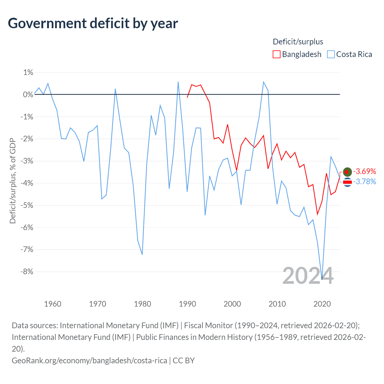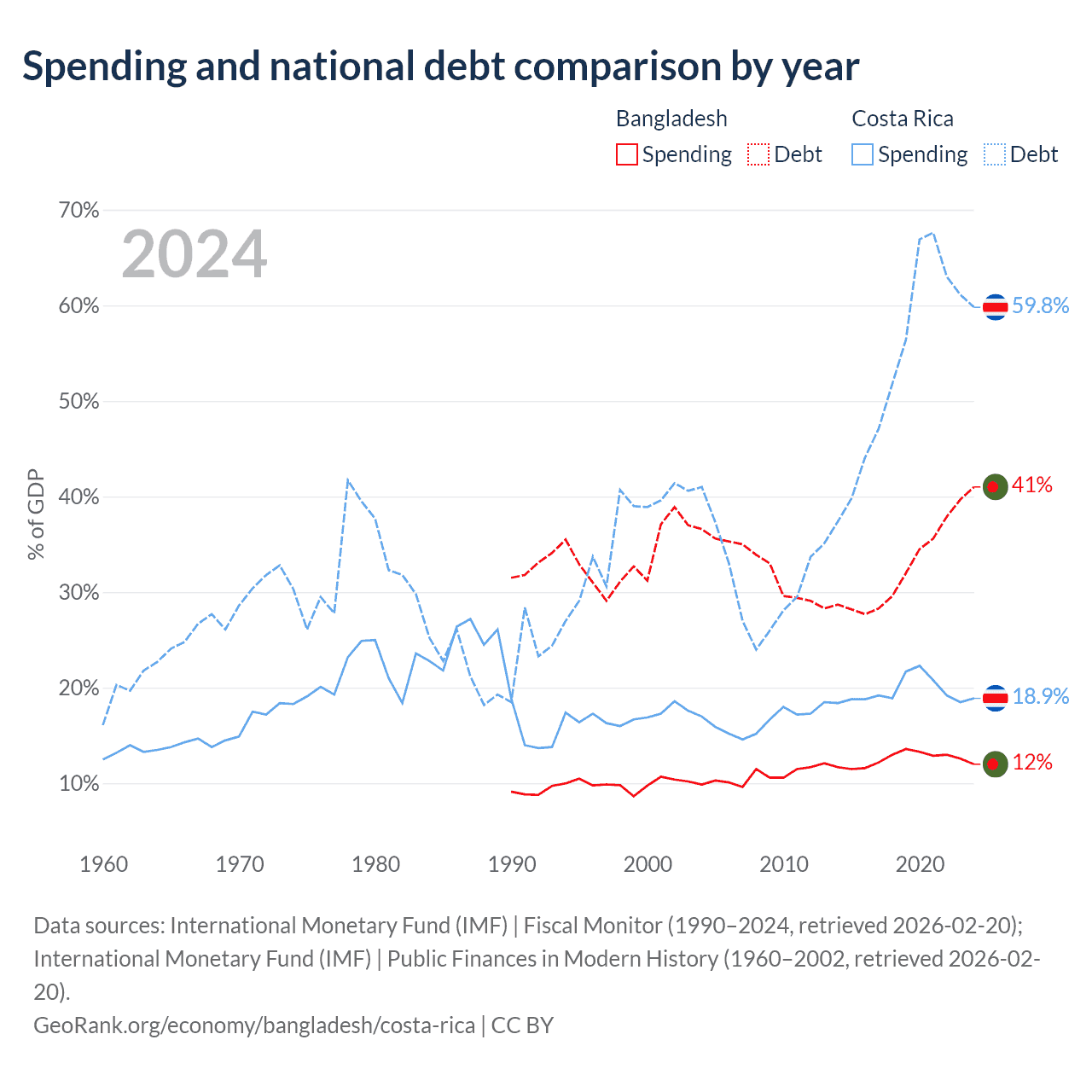 Bangladesh has $184B in government debt (41% of GDP), compared to $57B (59.8% of GDP) in Costa Rica.