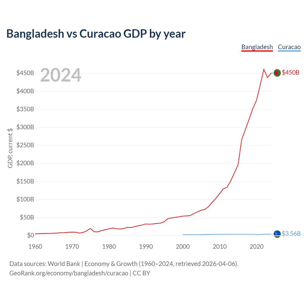 Bangladesh has a GDP of $450B compared to $3.56B for Curacao, ranking 36/197 and 167/197 by economy size, respectively.