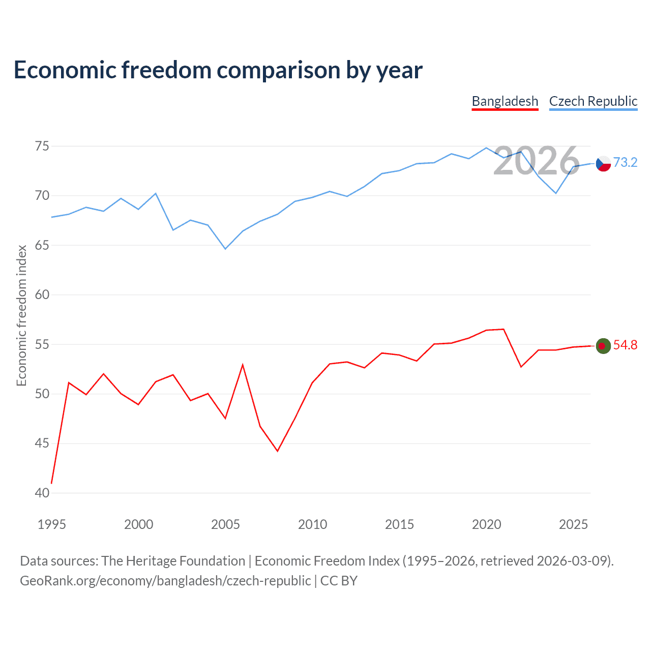 The Economic Freedom Index for Bangladesh is 54.8, ranking 131/197, compared to 73.2 for the Czech Republic, ranking 25/197. The chart above displays a comparison of annual changes in economic freedom indexes.