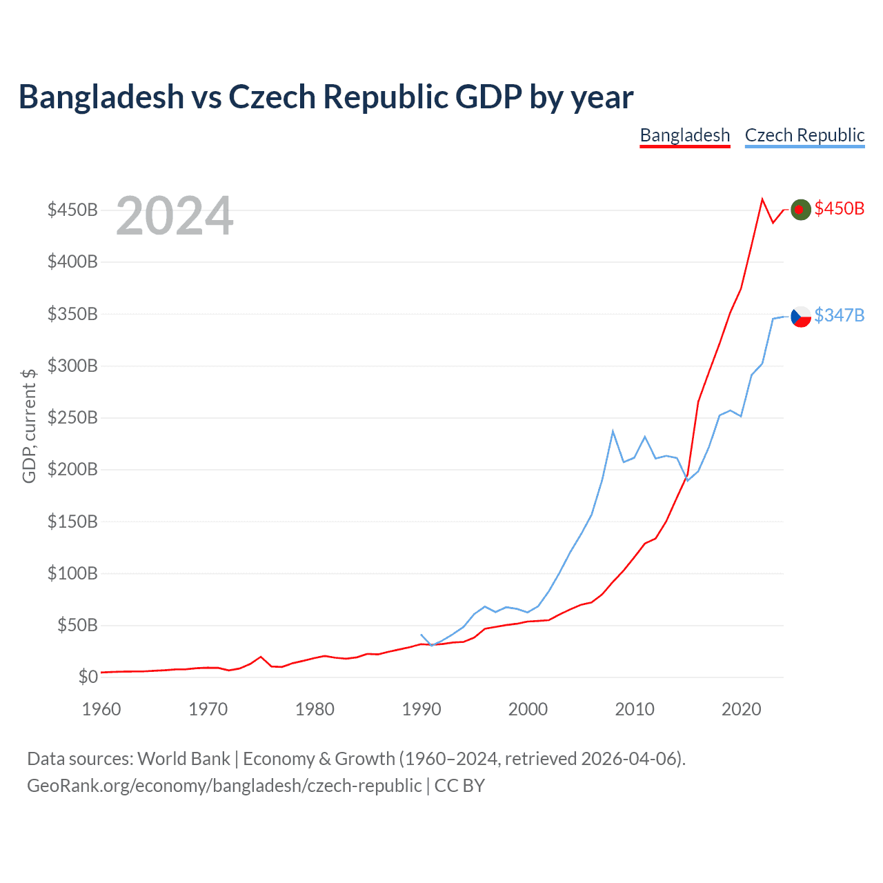 Bangladesh has a GDP of $450B compared to $347B for the Czech Republic, ranking 36/197 and 44/197 by economy size, respectively.