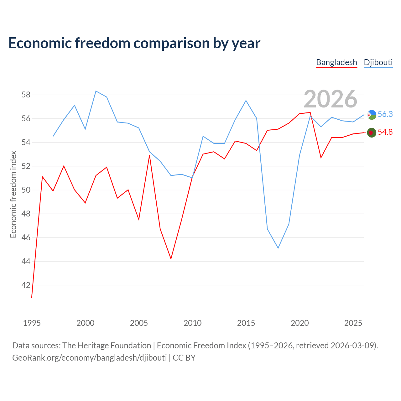 The Economic Freedom Index for Bangladesh is 54.8, ranking 131/197, compared to 56.3 for Djibouti, ranking 122/197. The chart above displays a comparison of annual changes in economic freedom indexes.