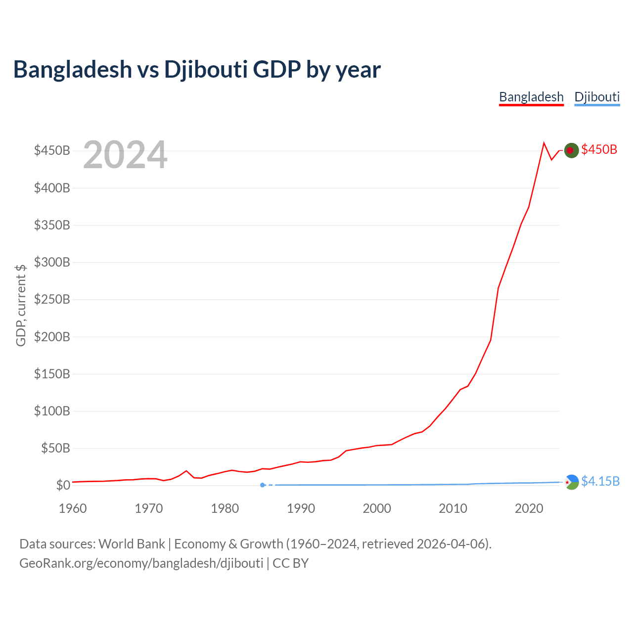 Bangladesh has a GDP of $450B compared to $4.15B for Djibouti, ranking 36/197 and 165/197 by economy size, respectively.