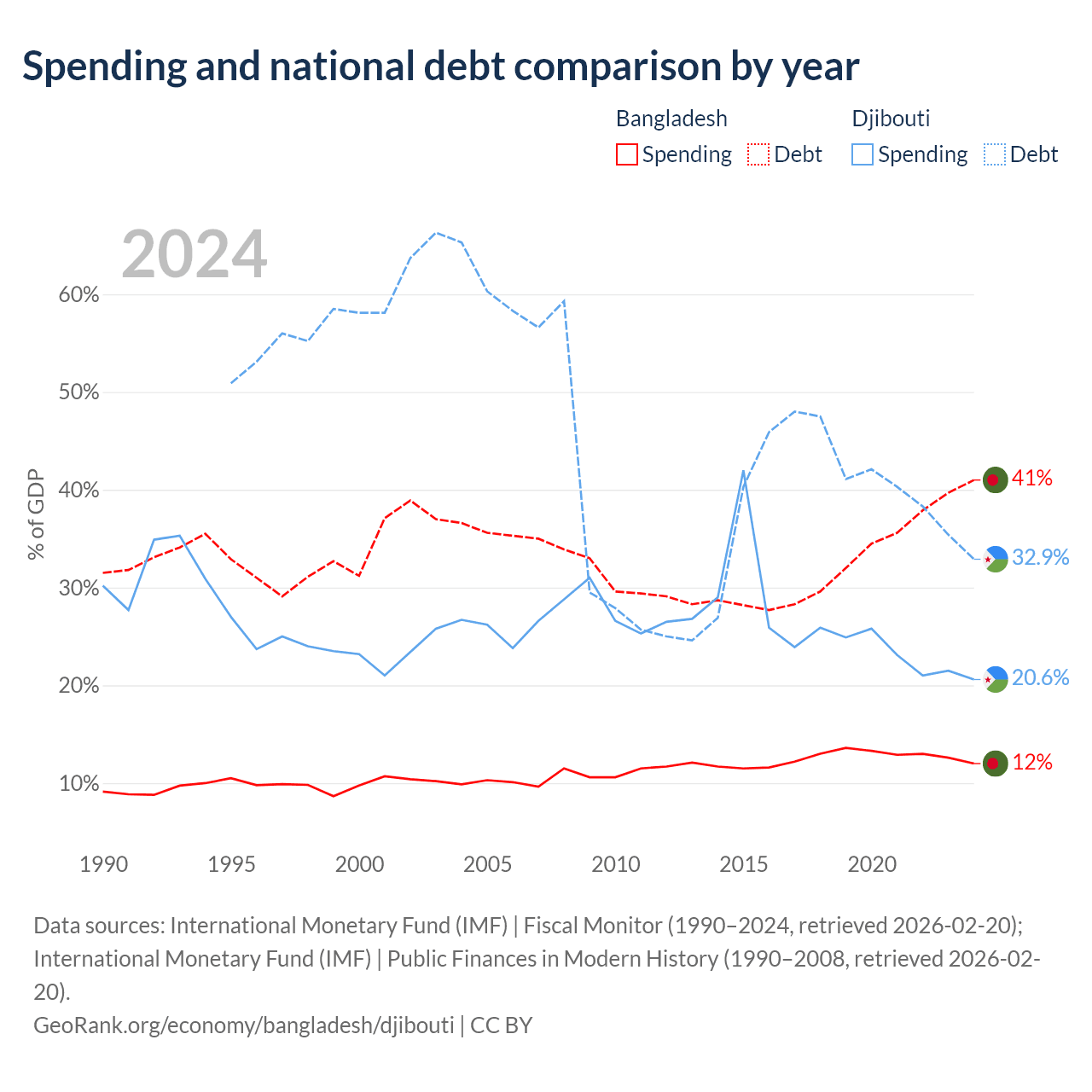 Bangladesh has $184B in government debt (41% of GDP), compared to $1.36B (32.9% of GDP) in Djibouti.