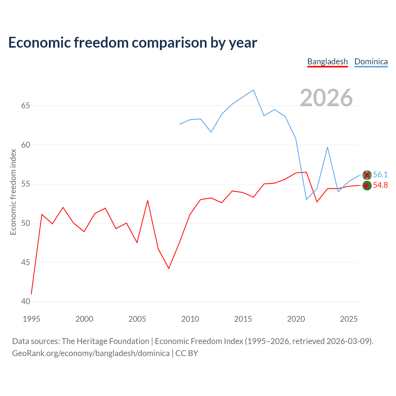 The Economic Freedom Index for Bangladesh is 54.8, ranking 131/197, compared to 56.1 for Dominica, ranking 124/197. The chart above displays a comparison of annual changes in economic freedom indexes.