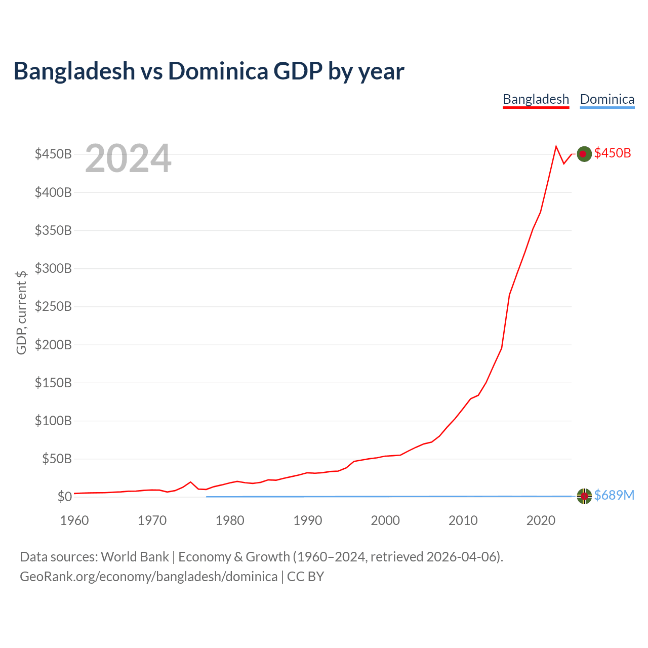 Bangladesh has a GDP of $450B compared to $689M for Dominica, ranking 36/197 and 190/197 by economy size, respectively.