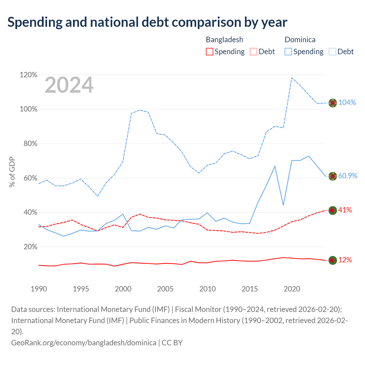 Bangladesh has $184B in government debt (41% of GDP), compared to $713M (103.5% of GDP) in Dominica.