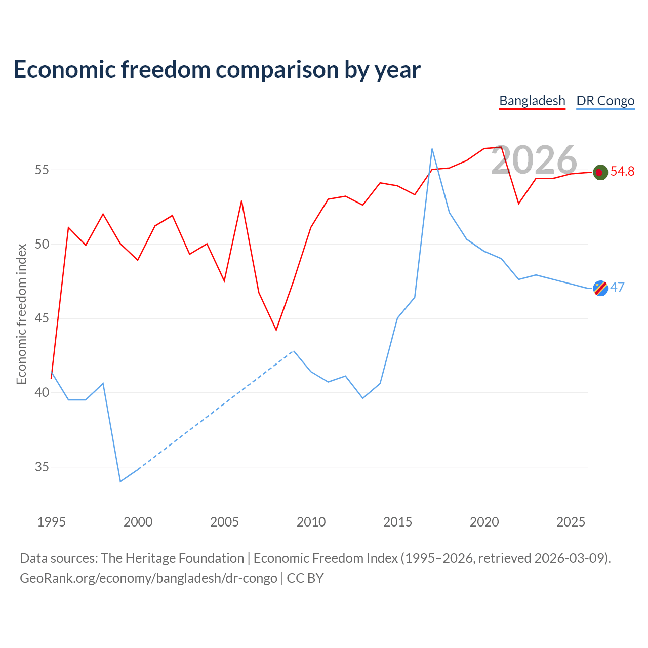 The Economic Freedom Index for Bangladesh is 54.8, ranking 131/197, compared to 47 for the DR Congo, ranking 176/197. The chart above displays a comparison of annual changes in economic freedom indexes.
