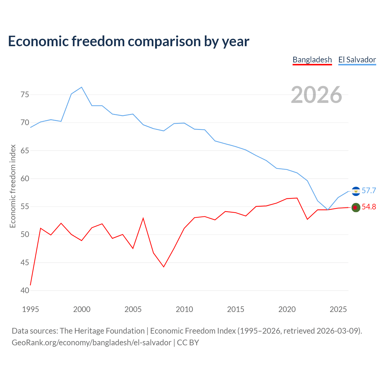 The Economic Freedom Index for Bangladesh is 54.8, ranking 131/197, compared to 57.7 for El Salvador, ranking 114/197. The chart above displays a comparison of annual changes in economic freedom indexes.