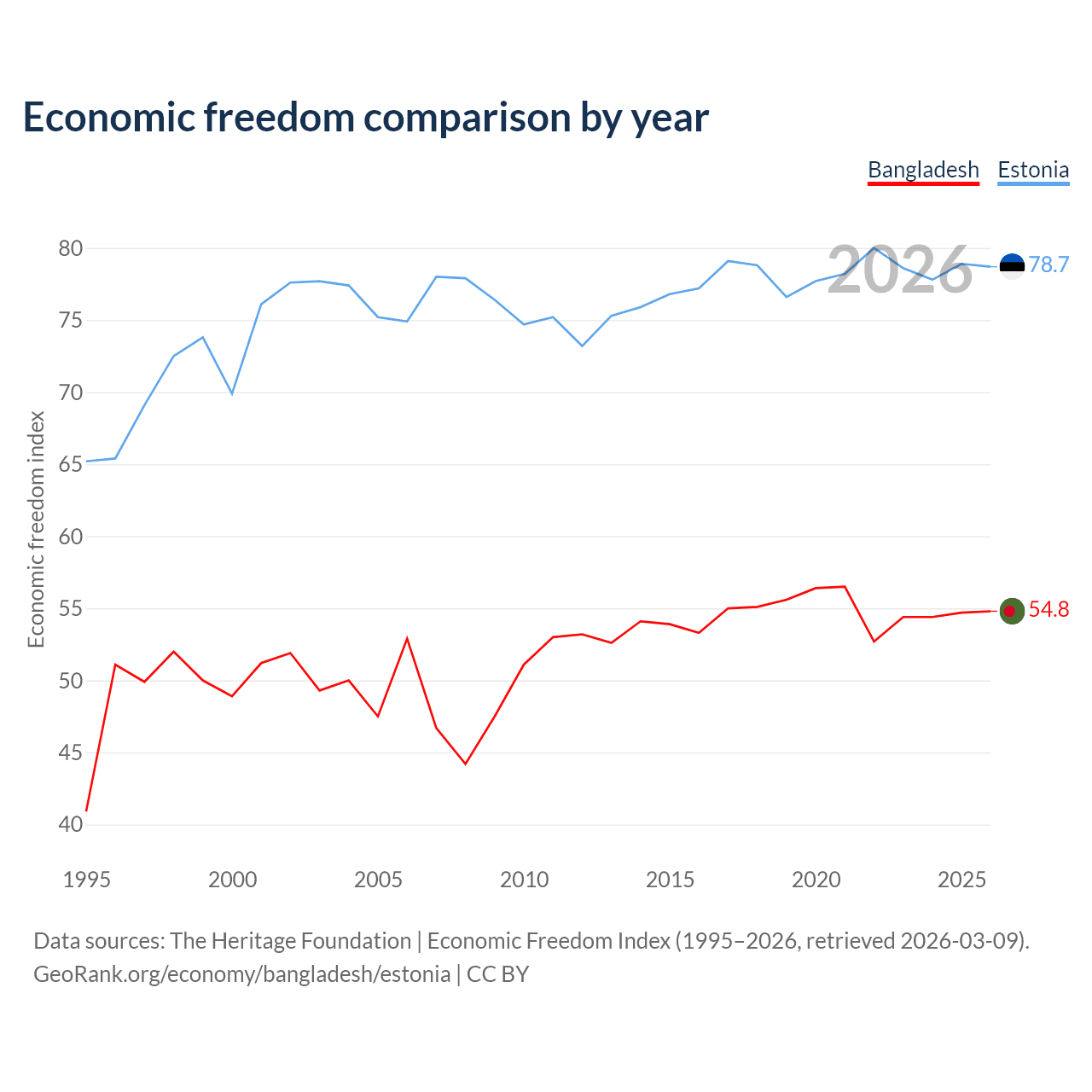 The Economic Freedom Index for Bangladesh is 54.8, ranking 131/197, compared to 78.7 for Estonia, ranking 10/197. The chart above displays a comparison of annual changes in economic freedom indexes.