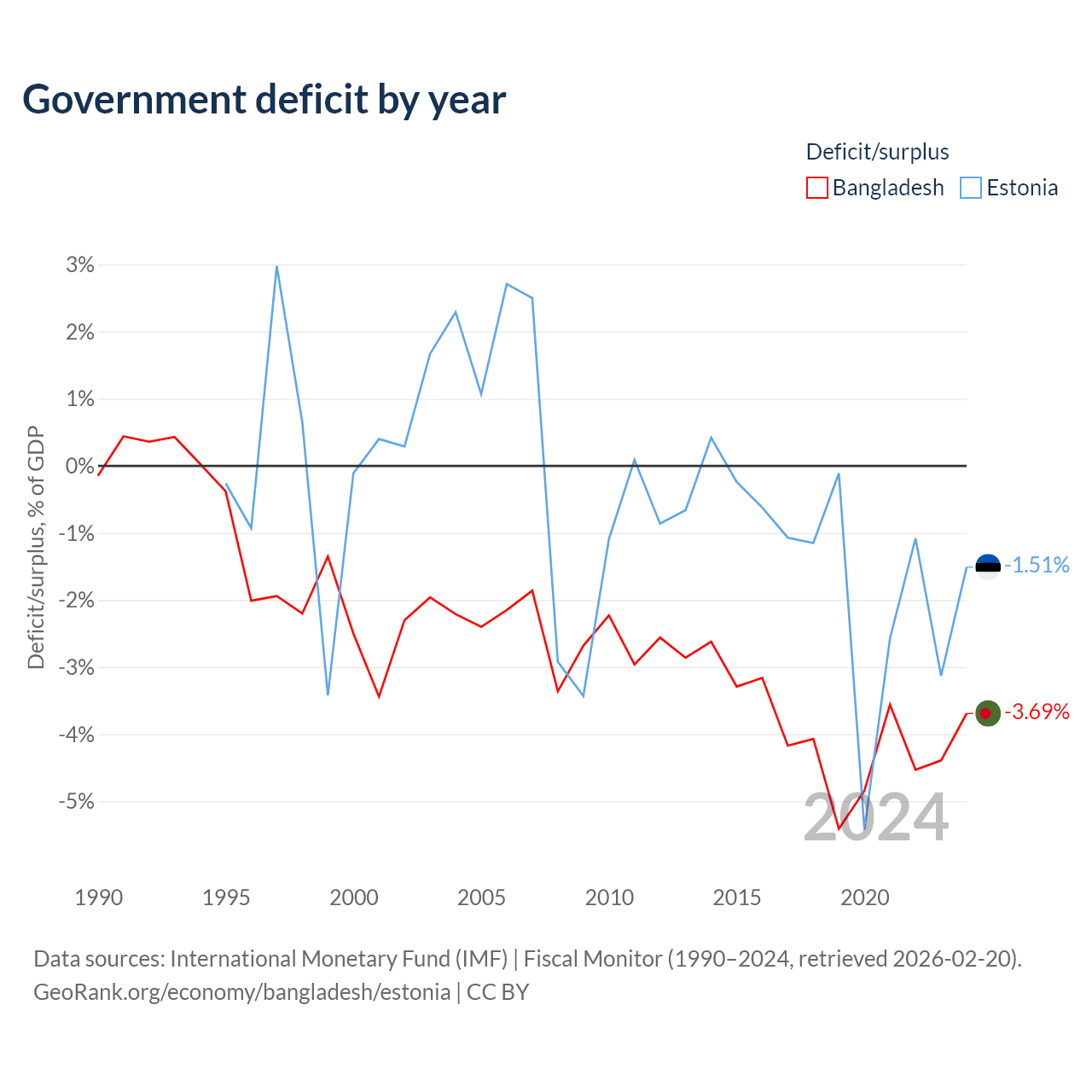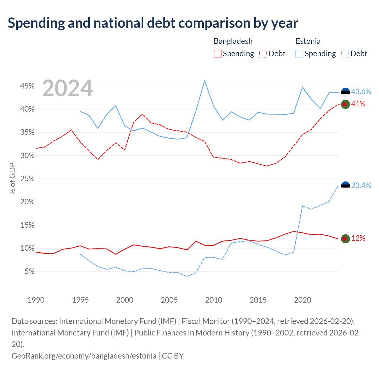 Bangladesh has $184B in government debt (41% of GDP), compared to $10.1B (23.4% of GDP) in Estonia.