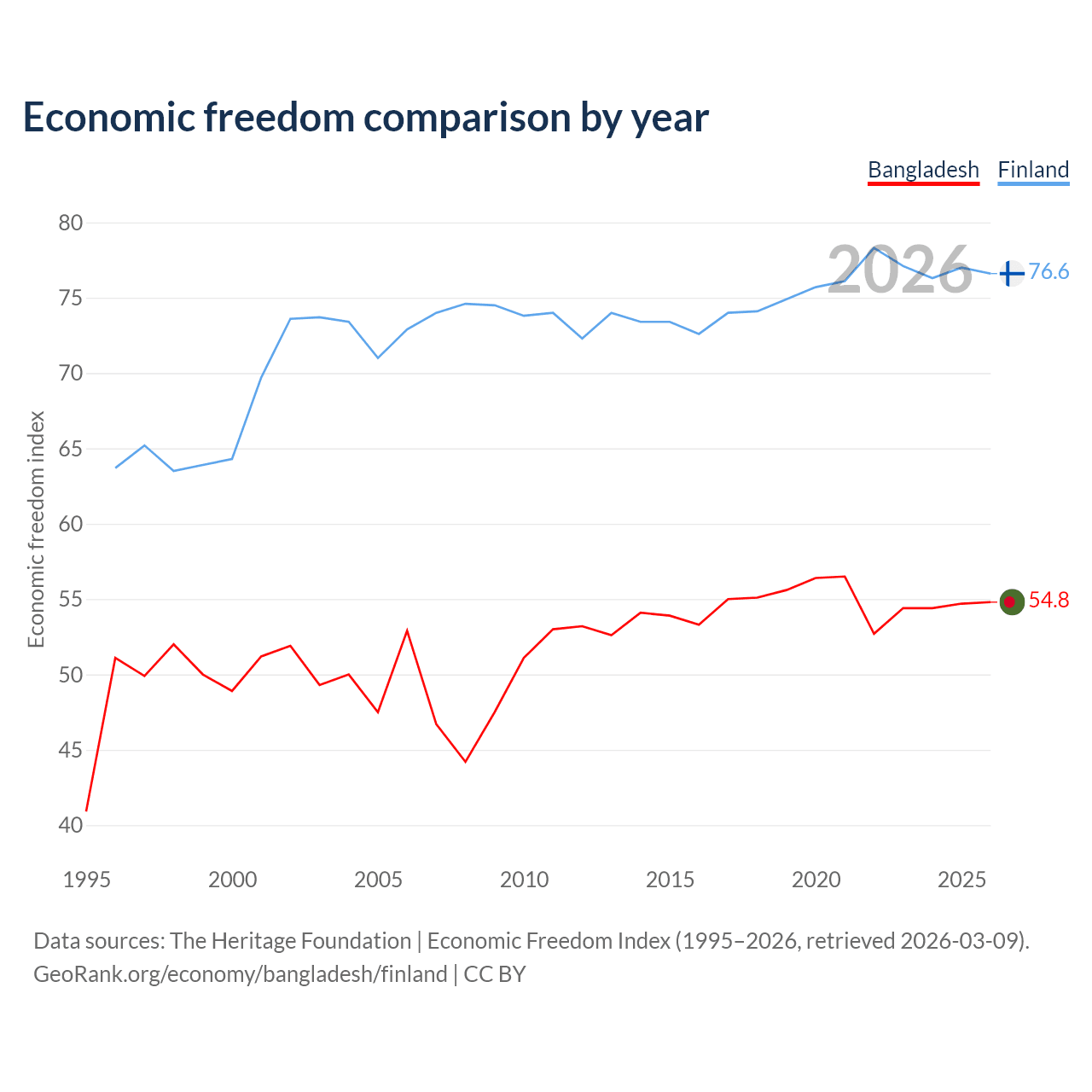 The Economic Freedom Index for Bangladesh is 54.8, ranking 131/197, compared to 76.6 for Finland, ranking 15/197. The chart above displays a comparison of annual changes in economic freedom indexes.