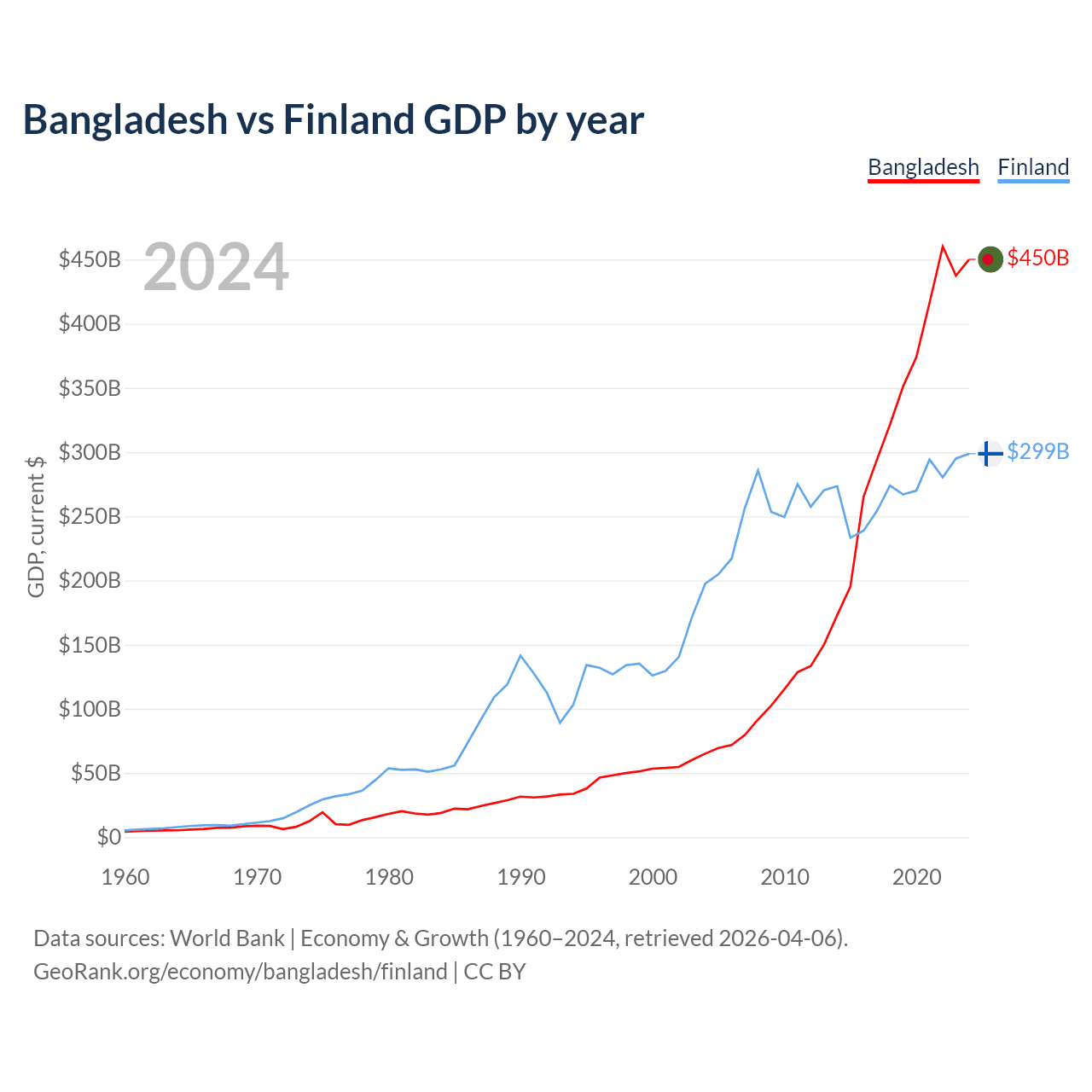 Bangladesh has a GDP of $450B compared to $299B for Finland, ranking 36/197 and 47/197 by economy size, respectively.