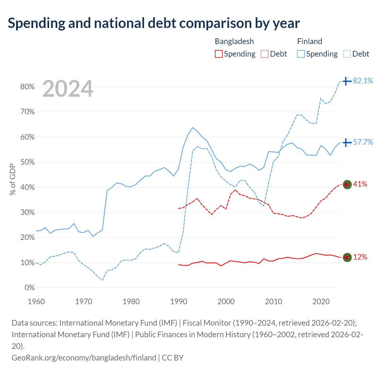 Bangladesh has $184B in government debt (41% of GDP), compared to $245B (82.1% of GDP) in Finland.